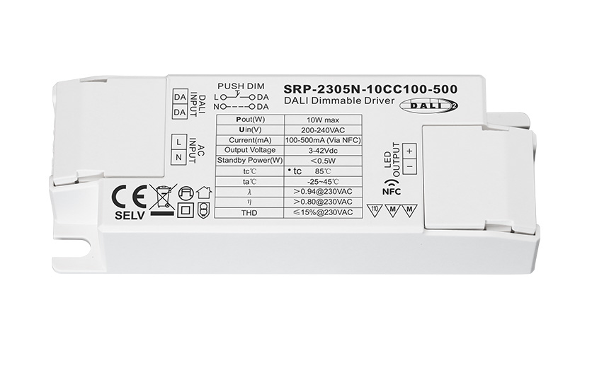 | DALI | 1通道 | 3-42V | 100-500mA via NFC setting; 最低設(shè)置電流檔位間隔低至 0.1mA | 200-240VAC/ 176-280VDC | 最大10W | >0.94 | 101*36*25mm(長(zhǎng)*寬*高) |